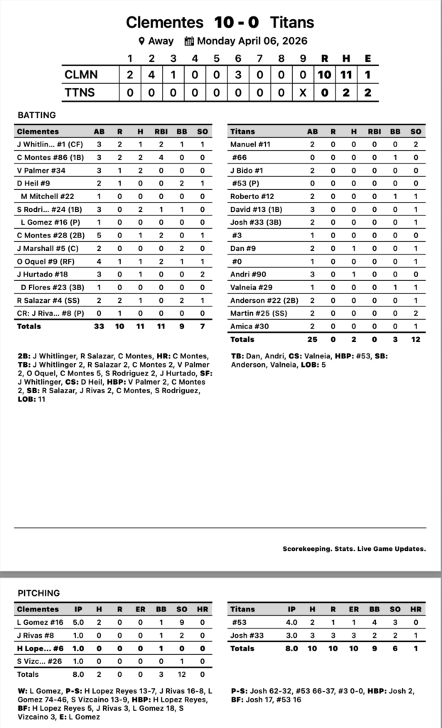 The Clementes wrapped up the first week of the ’26 season with another blowout win against the Titans. Leury Gomez #16 struck out 9 across five innings while giving up just two hits. Julio Rivas #8 would follow him with 2 more Ks in one inning of work. Hector Lopez-Reyes #6 and Samil Vizcaino #26 shut the door with two more shutout innings.